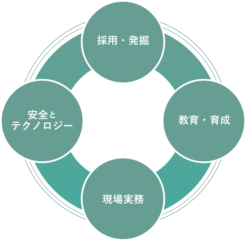 熟練のオペレーターを現場に送り出すことで工期や安全を守りつつ、未経験者や若い世代には段階的な教育プログラムを提供し、次の担い手を育てています。